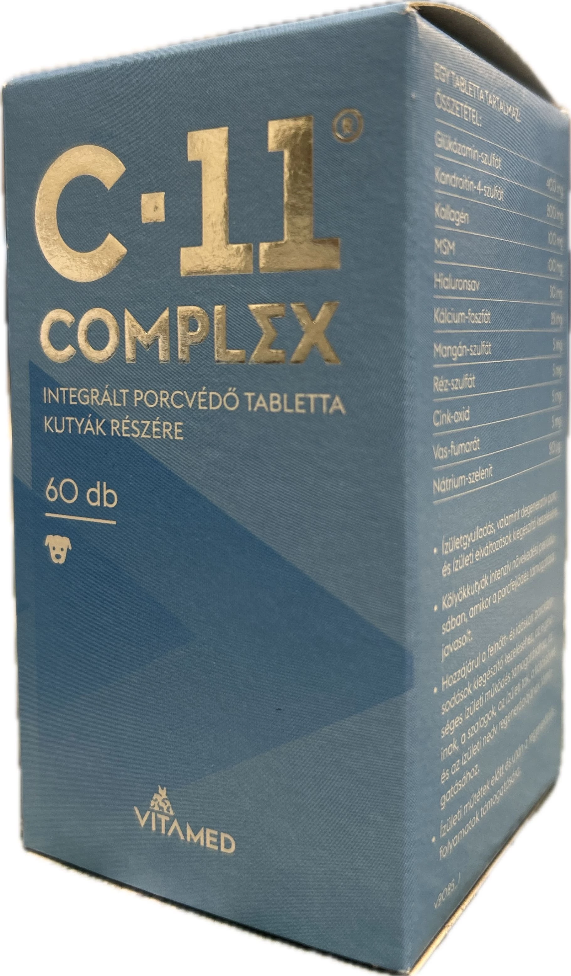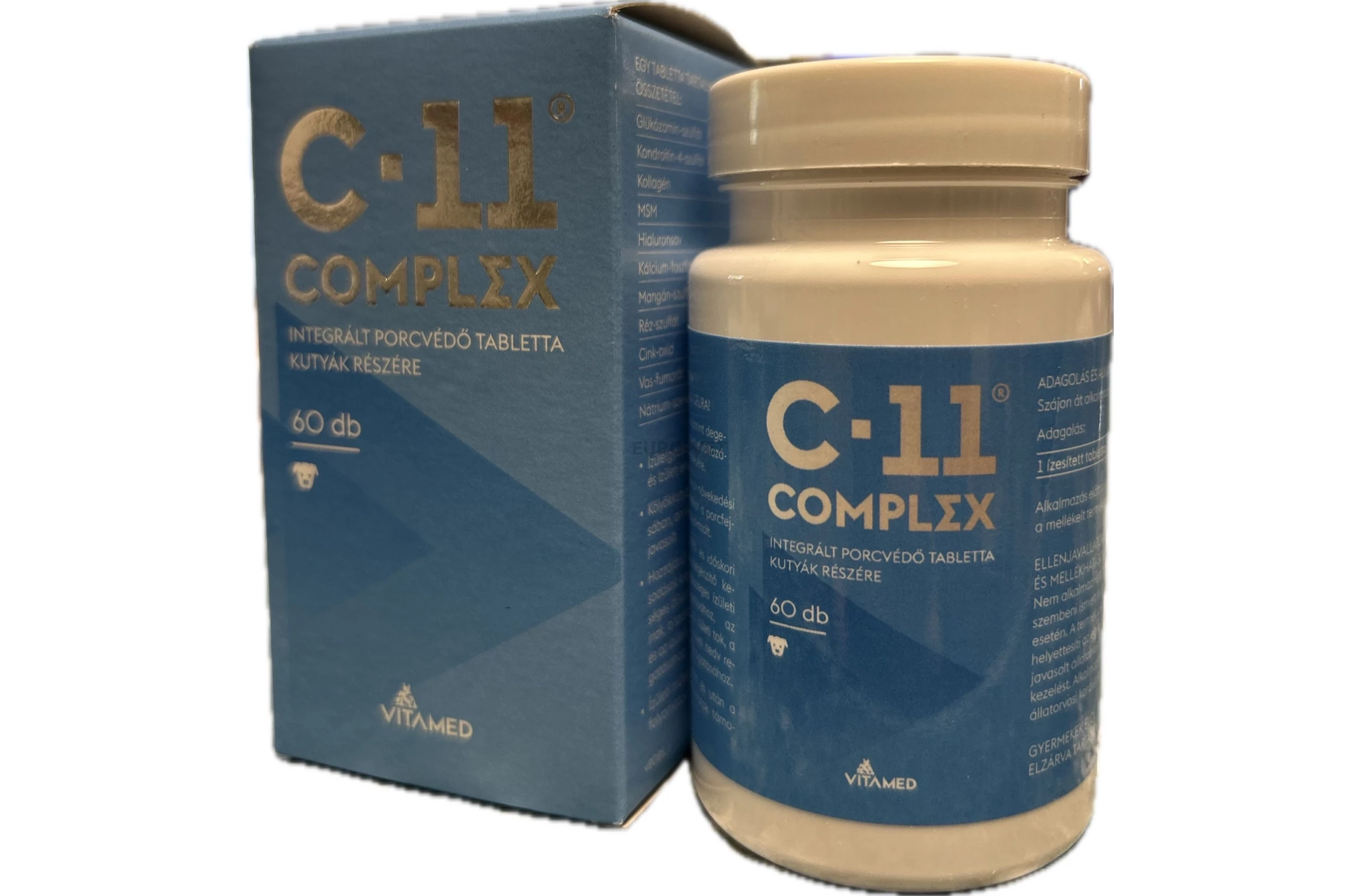 Alkalmazás módja:1 ízesített tabletta 20 testtömeg kilogrammra naponta egyszer.Az alkalmazás első 5 hetében (ún. feltöltési időszak)dupla dózis, azaz 2 tabletta/20 ttkg adása javasolt.A tünetek a C-11 Complex porcvédő első beadásától számított két héten belül enyhülnek, de a kívánt hatás elérése érdekében célszerű a tablettát kúraszerűen,3 hónapon át folyamatosan alkalmazni. Súlyos ízületkárosodás esetén a tabletta folyamatos adagolása javasolt. A tabletta különlegessége a kétrétegű ízesítés.A külső réteg sonka ízű, kellemes illatú, ezért az állatok a legtöbb esetben szívesen elfogyasztják.Beadható kis falatban vagy a táphoz keverve is, ekkor a tabletta belsejéből felszabaduló máj íz válik dominánssá