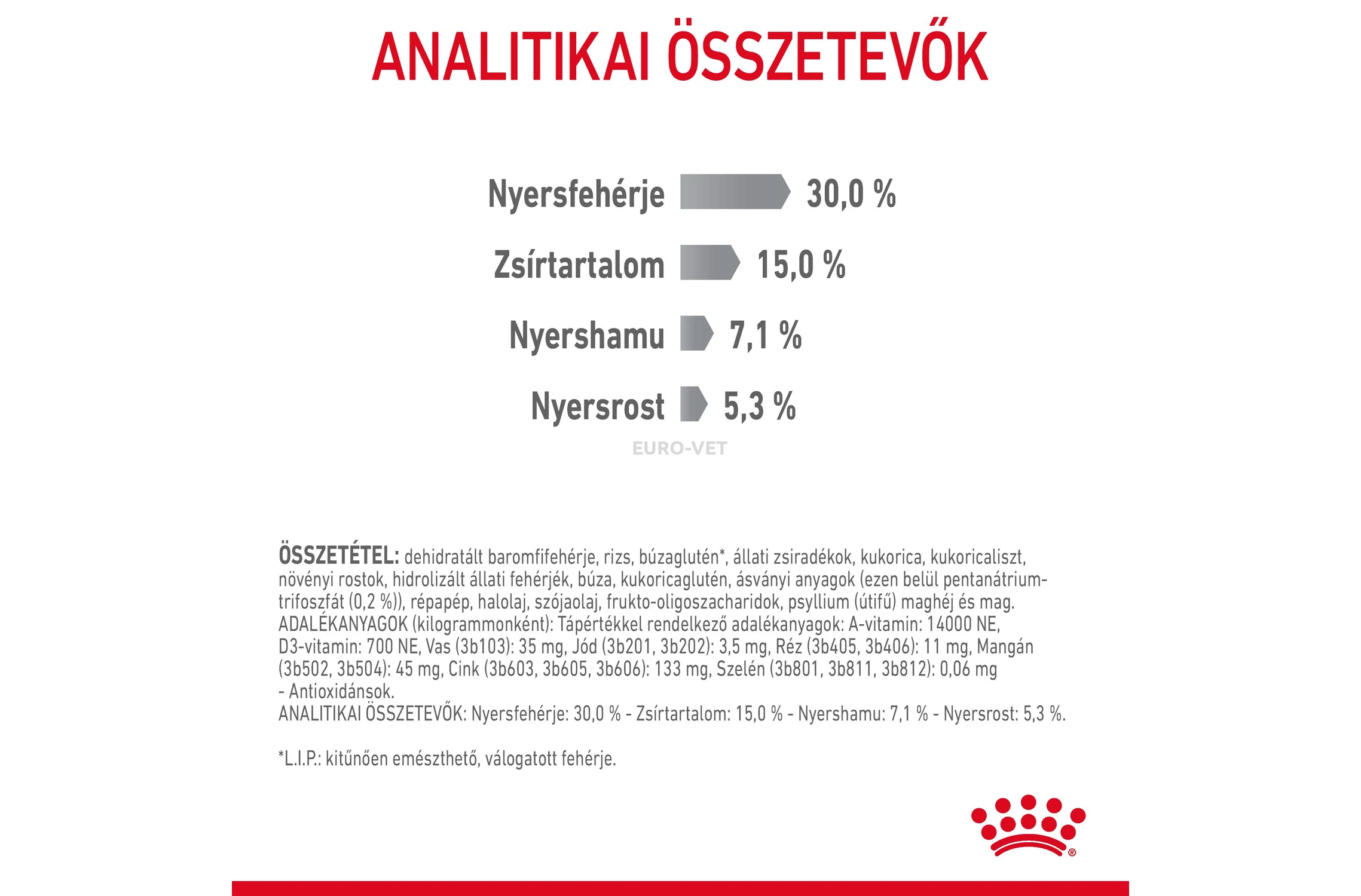 COMPOSITION: dehydrated poultry protein, rice, maize, vegetable protein isolate*, animal fats, maize flour, vegetable fibres, hydrolysed animal proteins, wheat, maize gluten, minerals, beet pulp, fish oil, fructo-oligo-saccharides, soya oil, psyllium husks and seeds.